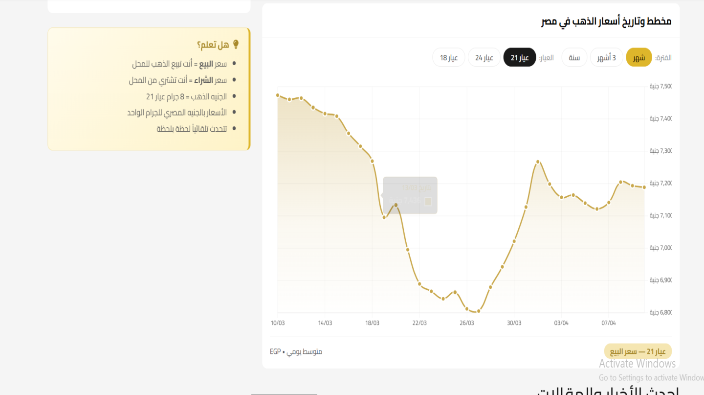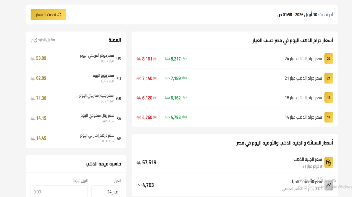 يقدم الموقع تغطية شاملة لأسعار الذهب بجميع الأعيرة (24، 21، 18)، مع تحديثات مستمرة لحركة السوق، بالإضافة إلى عرض أسعار الدولار والعملات الأجنبية مقابل الجنيه المصري.
