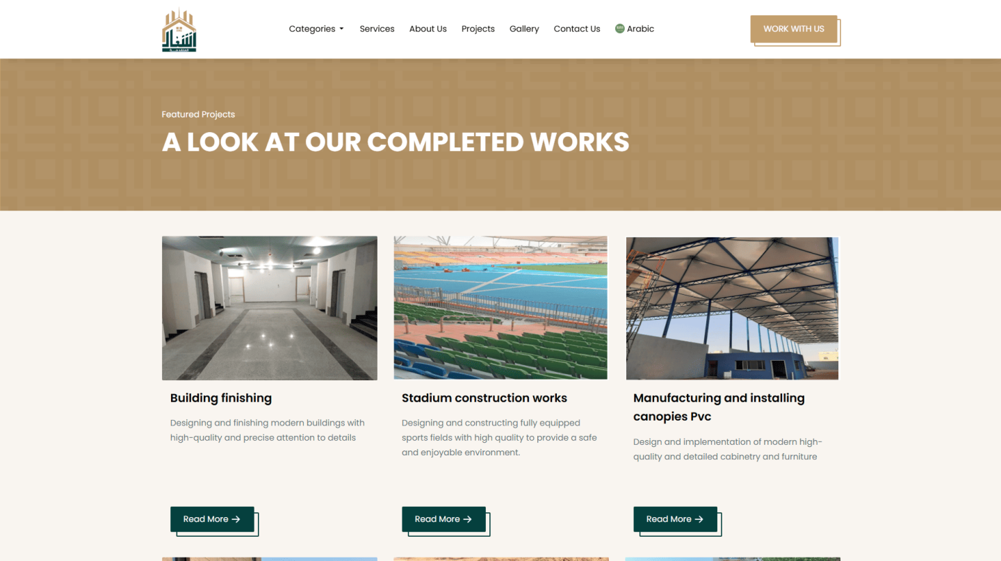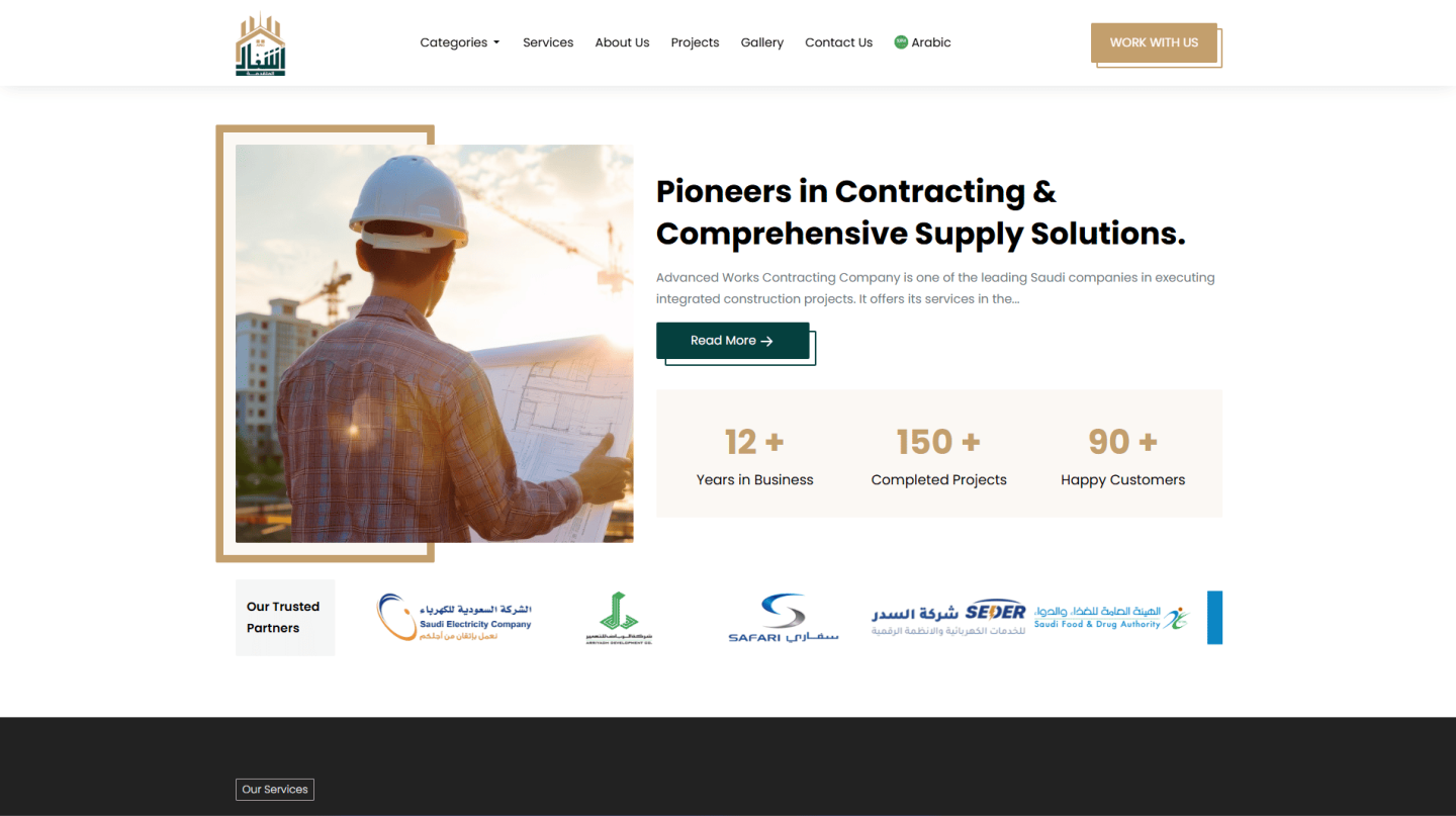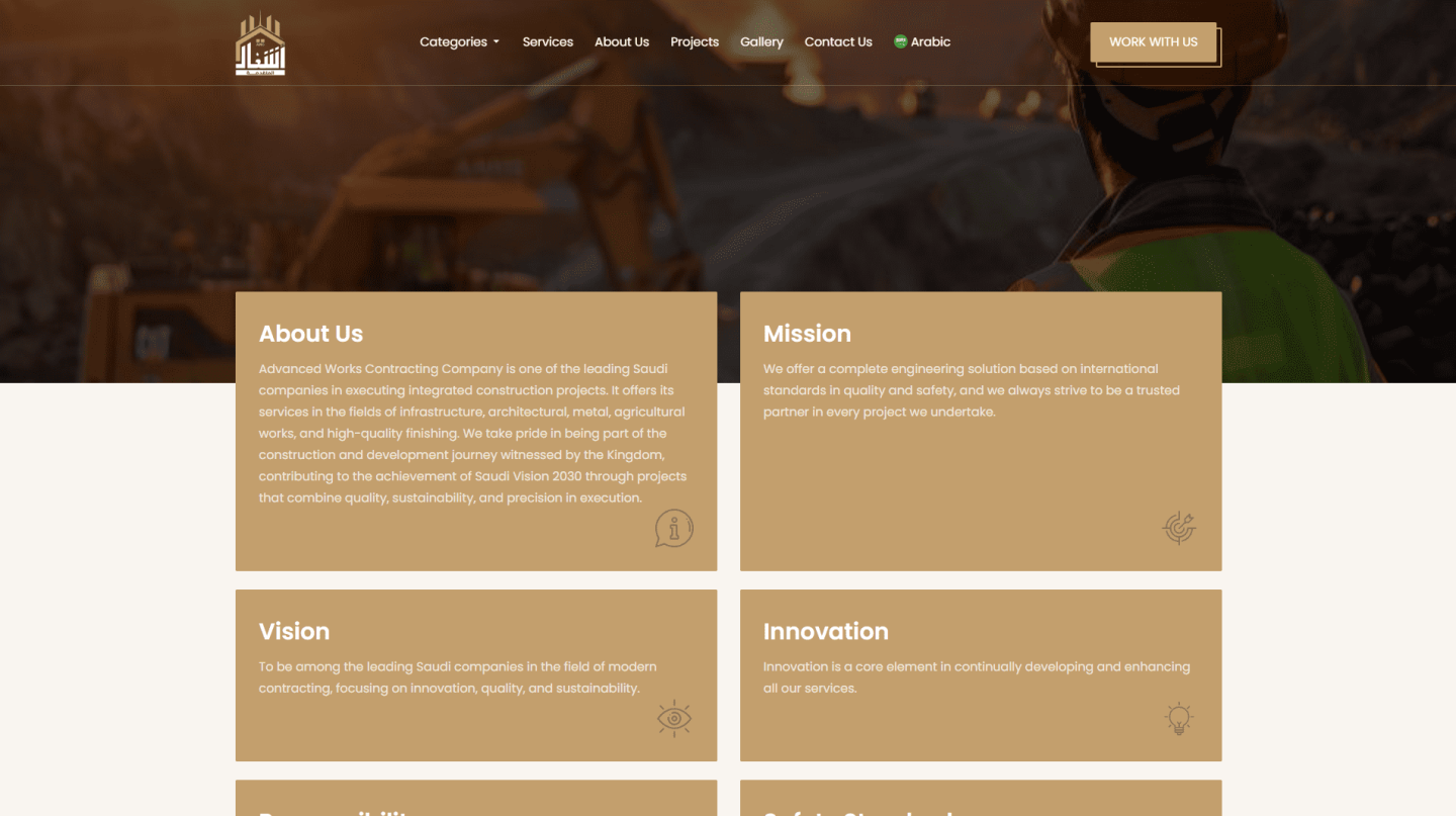 مؤسسة الأشغال المتقدمة منصة رقمية متكاملة لاستعراض سابقة أعمال الشركة في مجال المقاولات والخدمات الهندسية بالمملكة والخليج. يهدف ليكون الواجهة الرسمية التي تعكس الهوية المؤسسية والإبداع الهندسي باحترافية.
