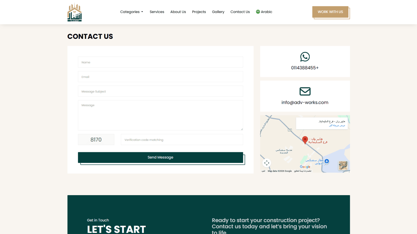 يتضمن الموقع واجهة ثنائية اللغة (عربي/إنجليزي)، معرض وسائط شامل للمشاريع، صفحة متقدمة لطلب عروض الأسعار مع إمكانية إرفاق الملفات، ولوحة تحكم مرنة لإدارة المحتوى والطلبات.