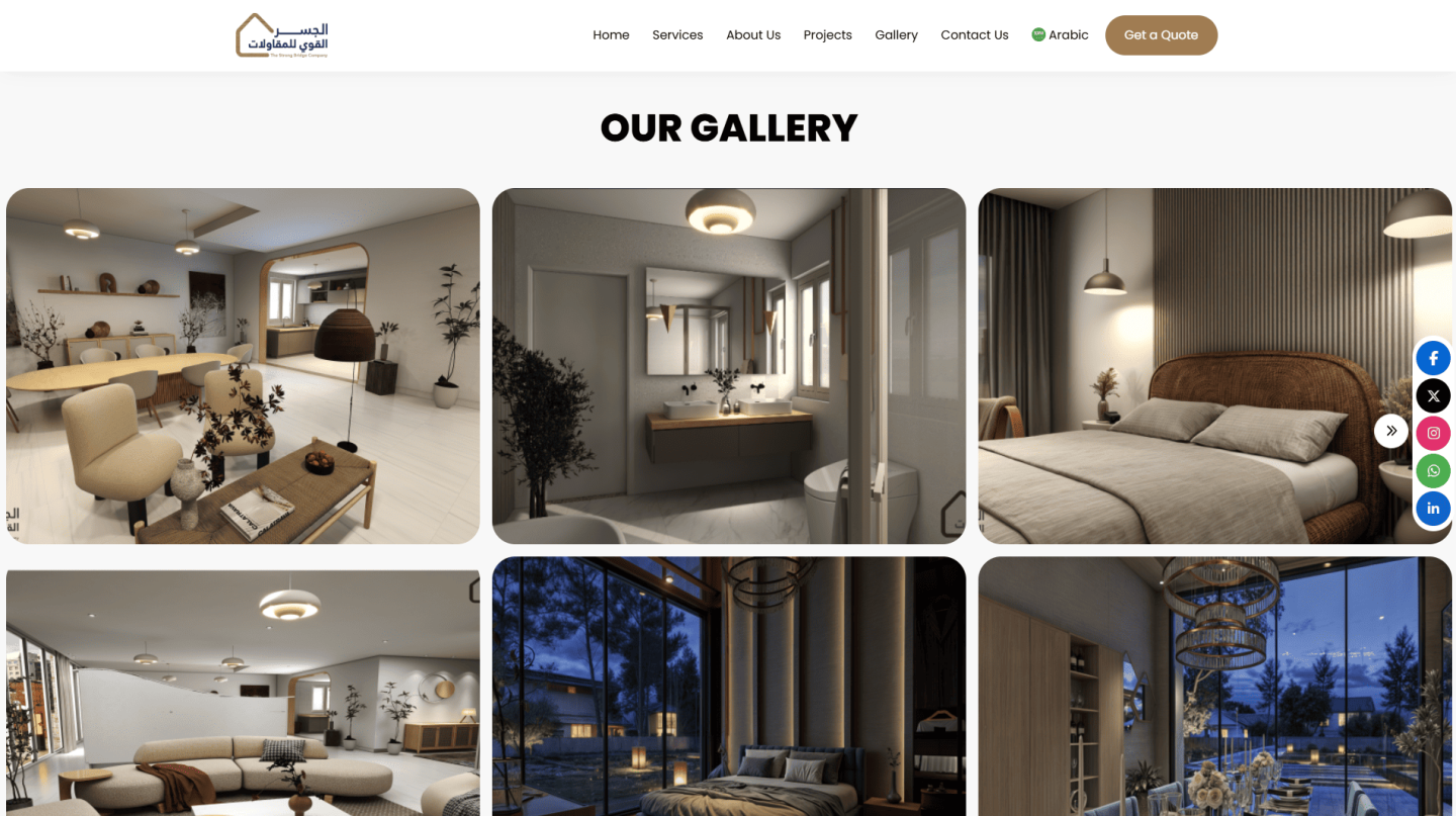 The site features a bilingual interface (Arabic/English), including a comprehensive media gallery for projects (photos and videos), an advanced "Request a Quote" page with file attachments, and a professional dashboard for seamless management of content and invoices.