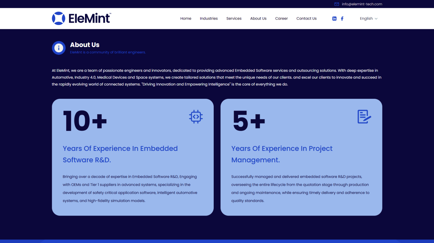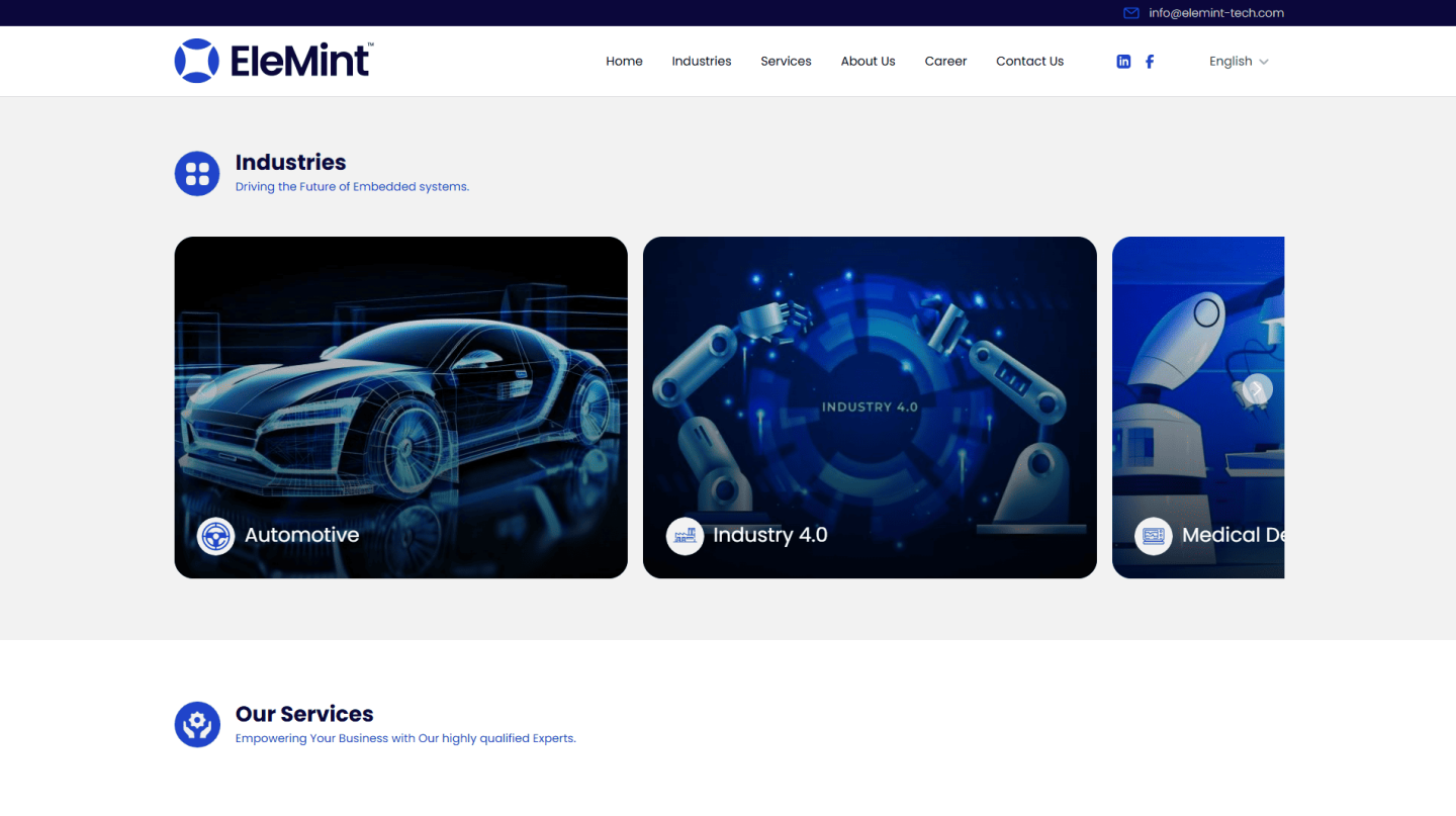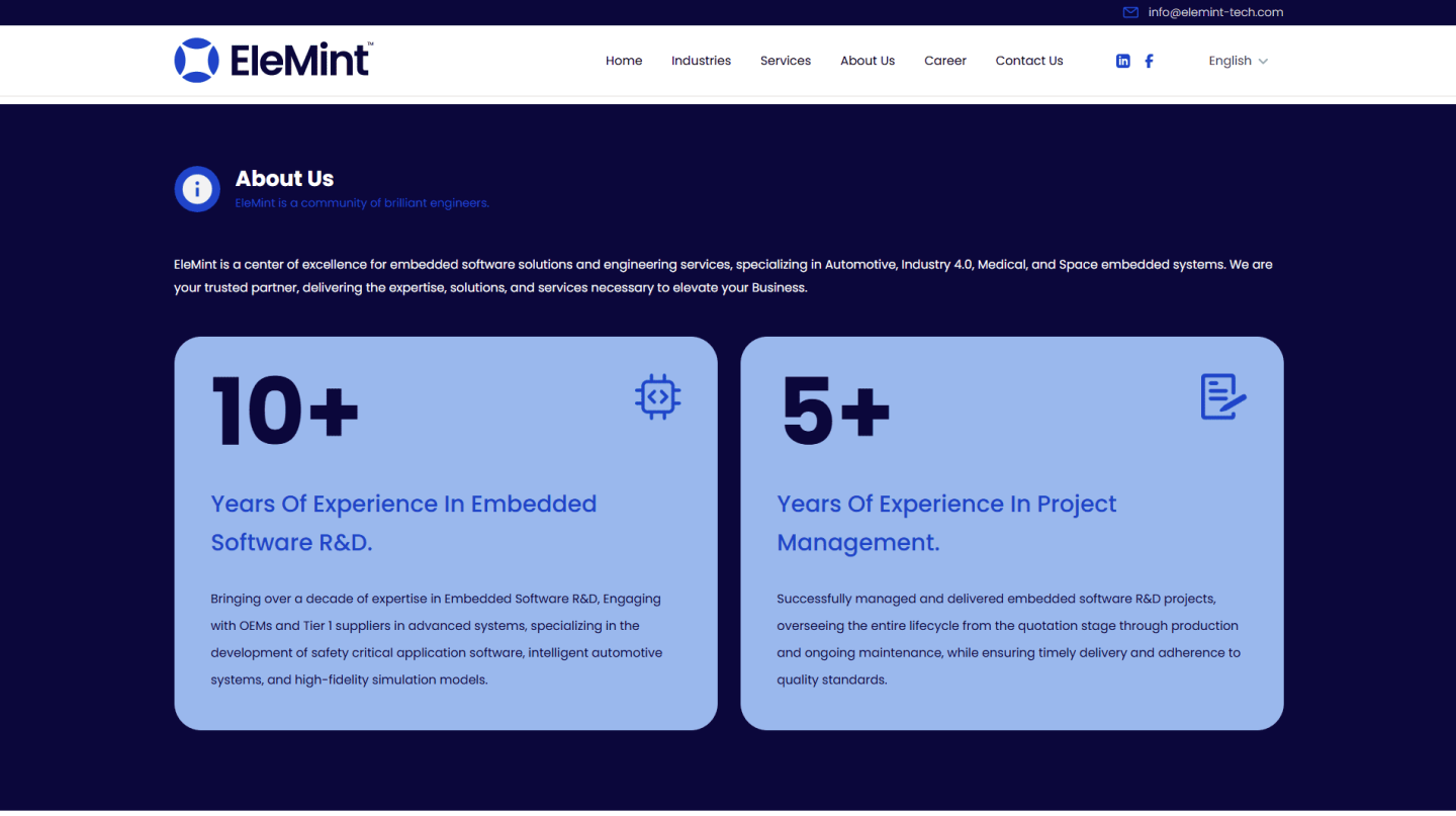 موقع إلكتروني احترافي لشركة Elemint Tech المتخصصة في البرمجيات المدمجة والأنظمة الذكية للسيارات والصناعة المتقدمة. تصميم متجاوب يبرز الخبرة الهندسية ويجذب عملاء استراتيجيين